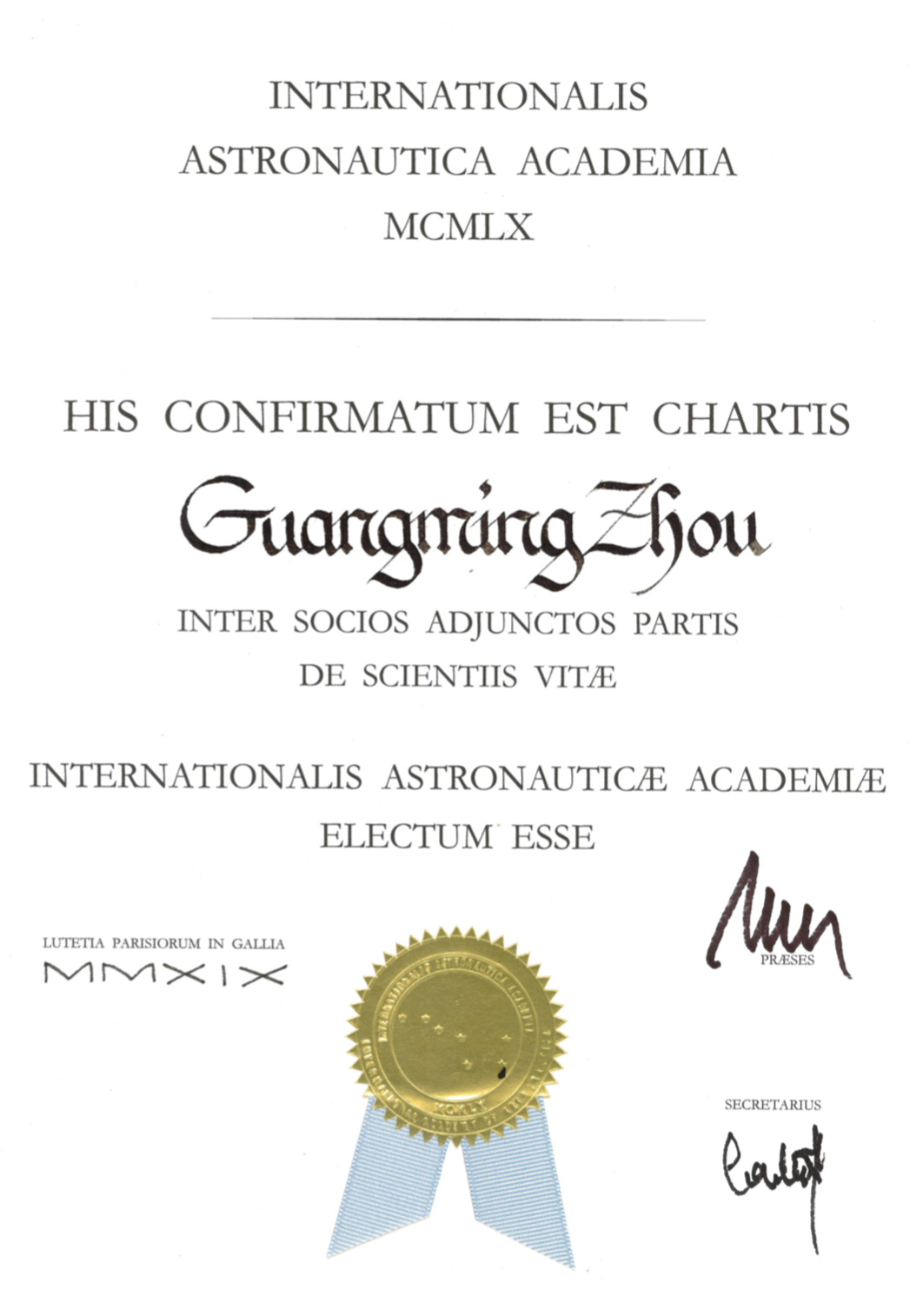 獲得的國(guó)際宇航科學(xué)院院士證書