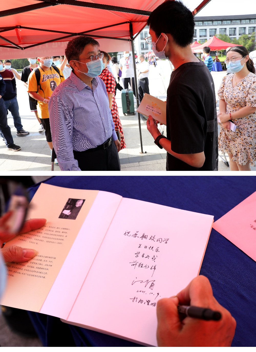 機電工程學院的新生蔡翱駿同學恰逢生日,學院為他精心準備了一份暖心禮物——朱光潛先生撰寫的《給青年的十二封信》一書。江涌書記現場為蔡翱駿同學送上生日祝福,并在新書扉頁上題寫了親筆祝福。“初入大學,我是不安與緊張的,但學校的安排、江書記的鼓勵讓我感受到了蘇大的人文關懷,倍感驚喜、倍受激勵。在以后的學習生活中,我會更加努力,不辜負各位老師的期待。” 蔡翱駿感動地說。