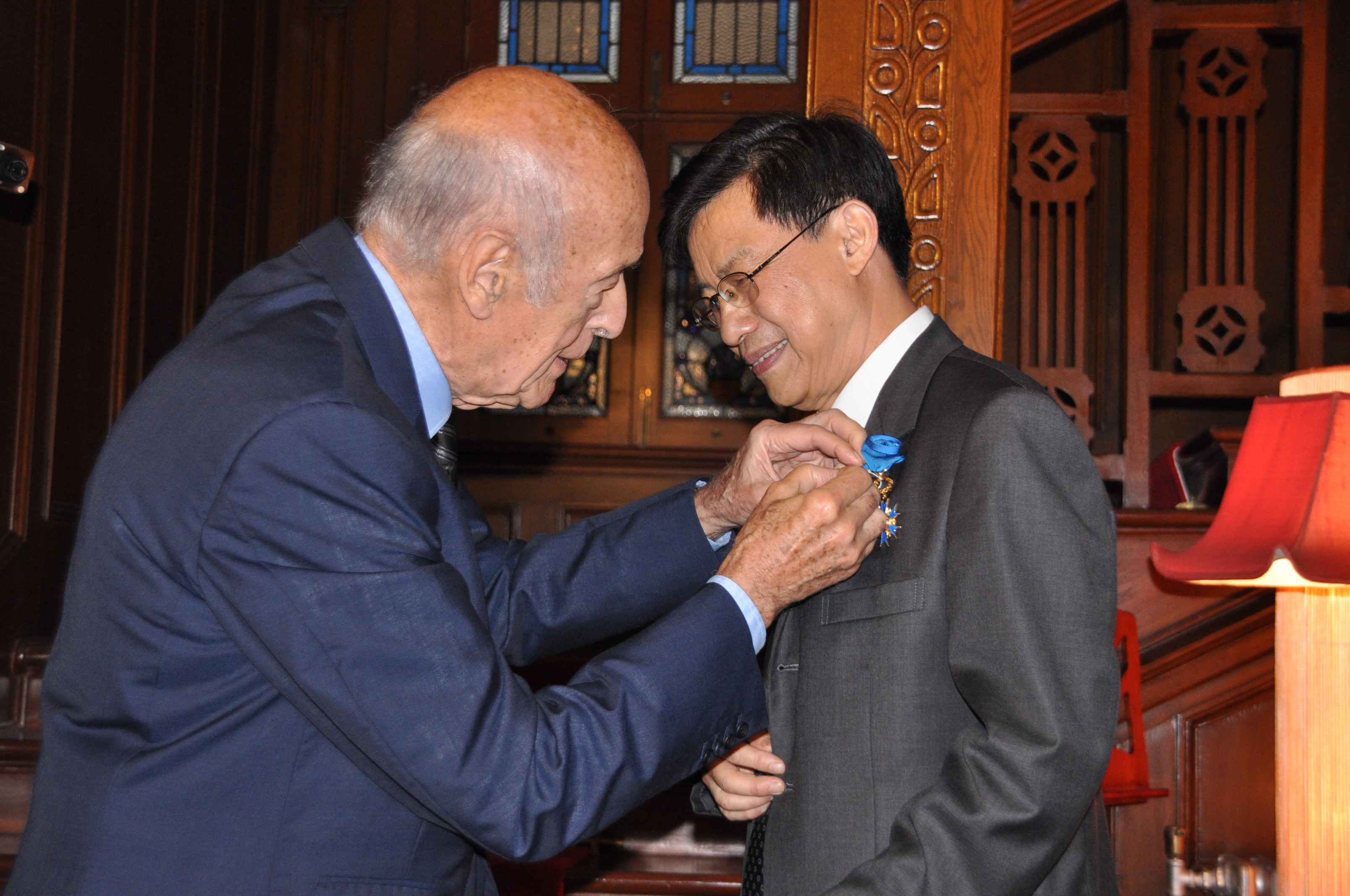 2011年法國前總統(tǒng)斯坦先生向阮長耿院士授予法蘭西國家功績軍官勛章