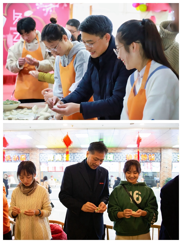 師生齊聚,喜迎冬至。校黨委副書記鄧敏副校長楊一心分別來到天賜莊校區和獨墅湖校區學生餐廳,與同學們一起包餃子、吃團圓飯,暢談學習生活,分享人生經驗,其樂融融!同學們還向保安大叔和宿管阿姨送上了自己親手包的餃子和寫滿暖心話語的明信片,以感謝他們的辛勤付出與守護。太感謝同學們了,天氣這么冷還麻煩你們送餃子過來,心里暖暖的!保安大叔們端起手中餃子難掩激動的心情。