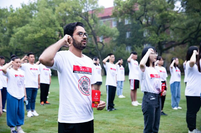 9月16日早上5點(diǎn)42分,伴隨著清晨第一縷陽(yáng)光,120位蘇州大學(xué)2020級(jí)新生身穿印有蘇大logo的文化衫,在鐘樓草坪前以一場(chǎng)集體形式感知大學(xué)精神文脈,迎來(lái)了人生當(dāng)中的一個(gè)重要場(chǎng)景。校黨委書(shū)記江涌、校長(zhǎng)熊思東,黨委副書(shū)記鄧敏、劉標(biāo),副校長(zhǎng)楊一心,紀(jì)委書(shū)記、監(jiān)察專員芮國(guó)強(qiáng),副校長(zhǎng)陳衛(wèi)昌,總會(huì)計(jì)師周高,各學(xué)院(部)、相關(guān)職能部門(mén)負(fù)責(zé)人出席開(kāi)學(xué)典禮。