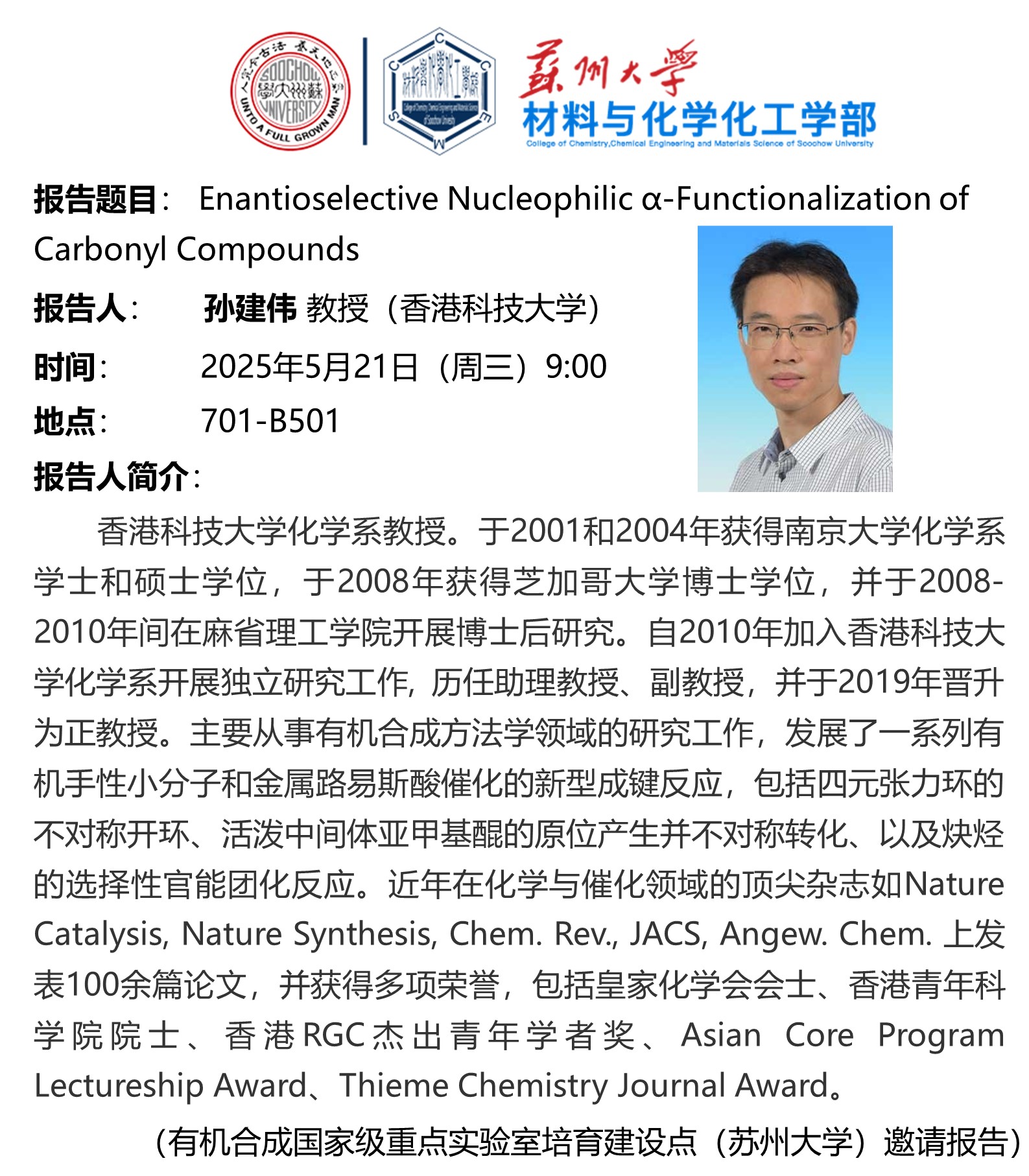 材料與化學化工學部學術報告:Enantioselective Nucleophilic α-Functionalization of Carbonyl Compounds